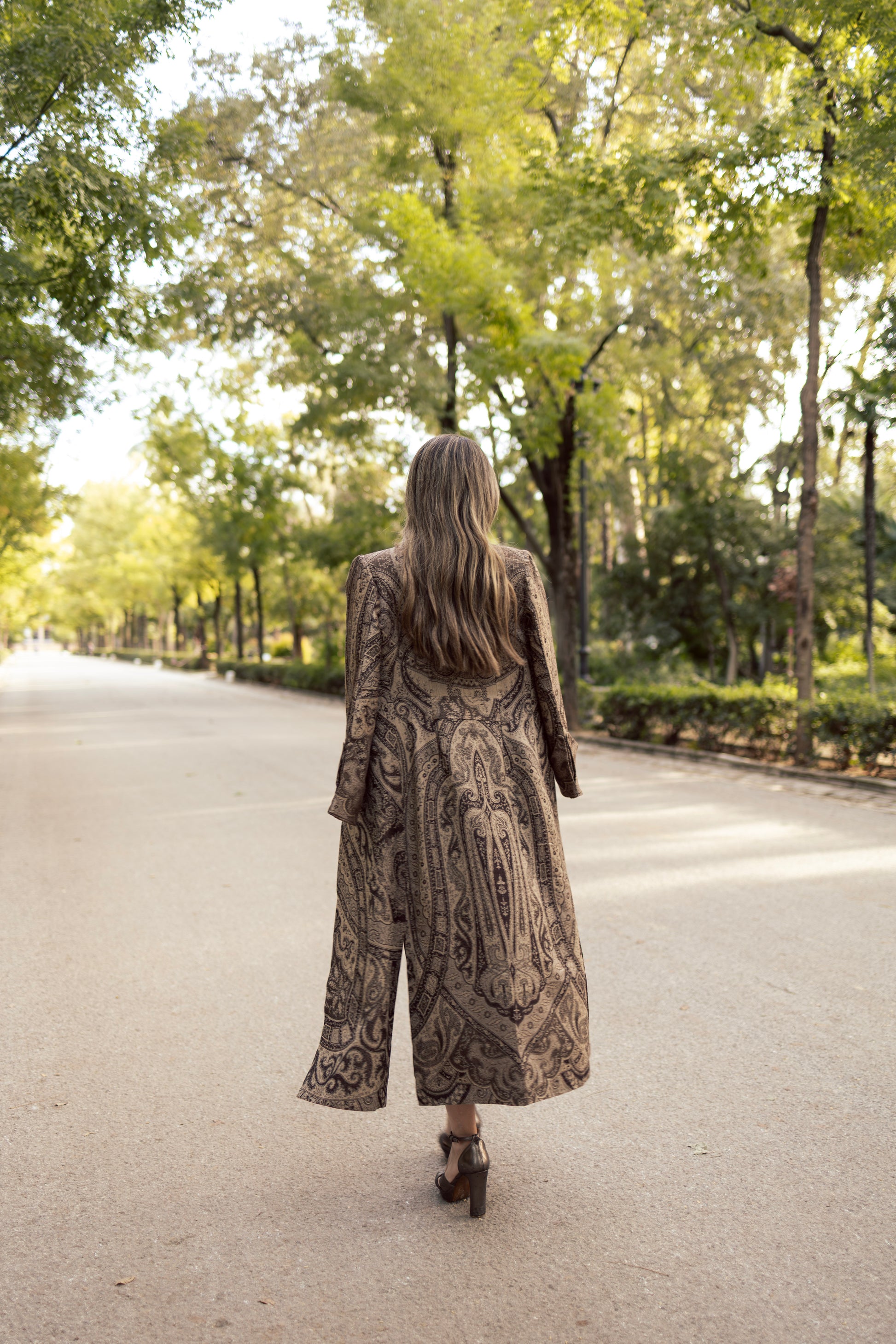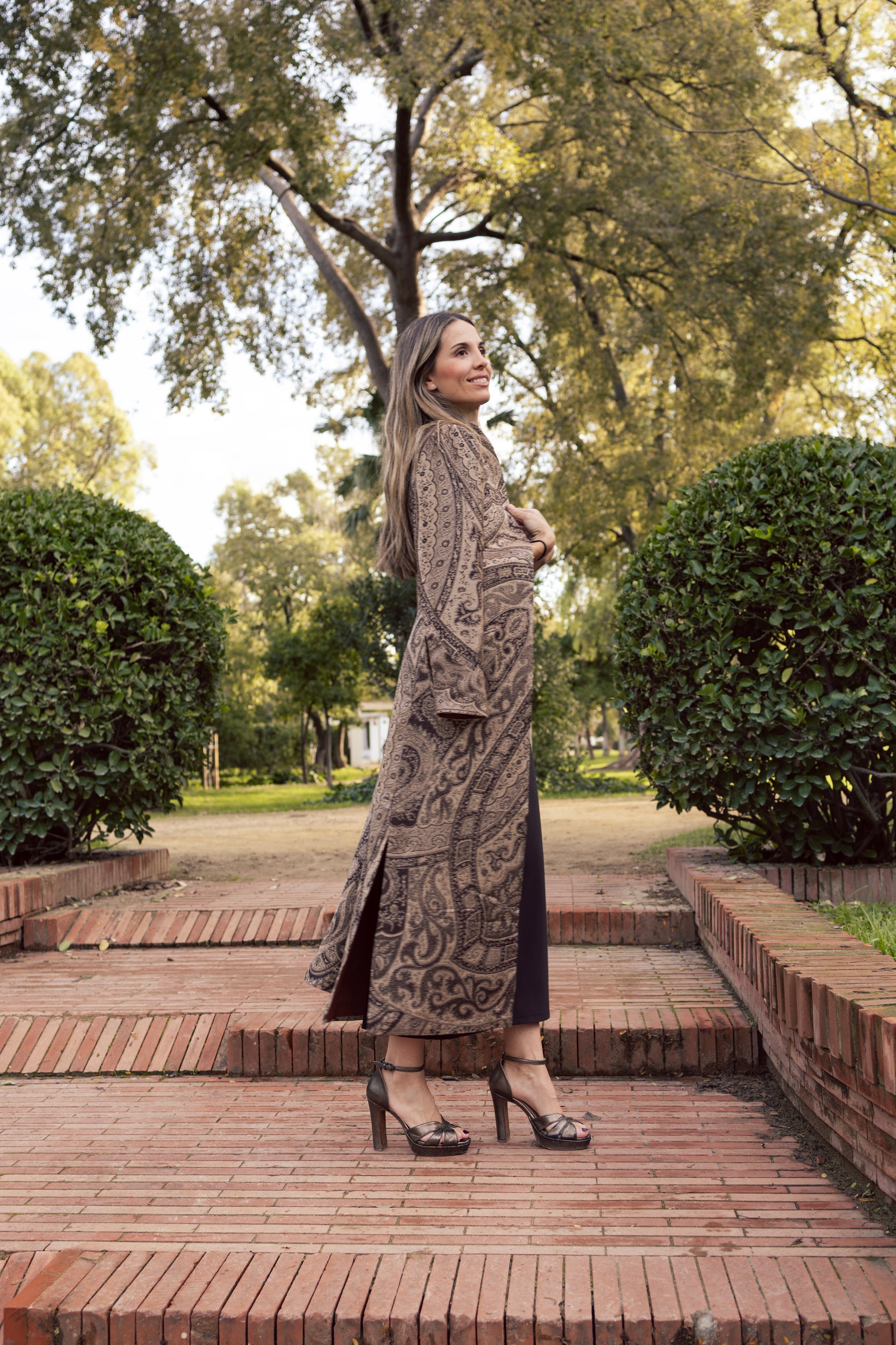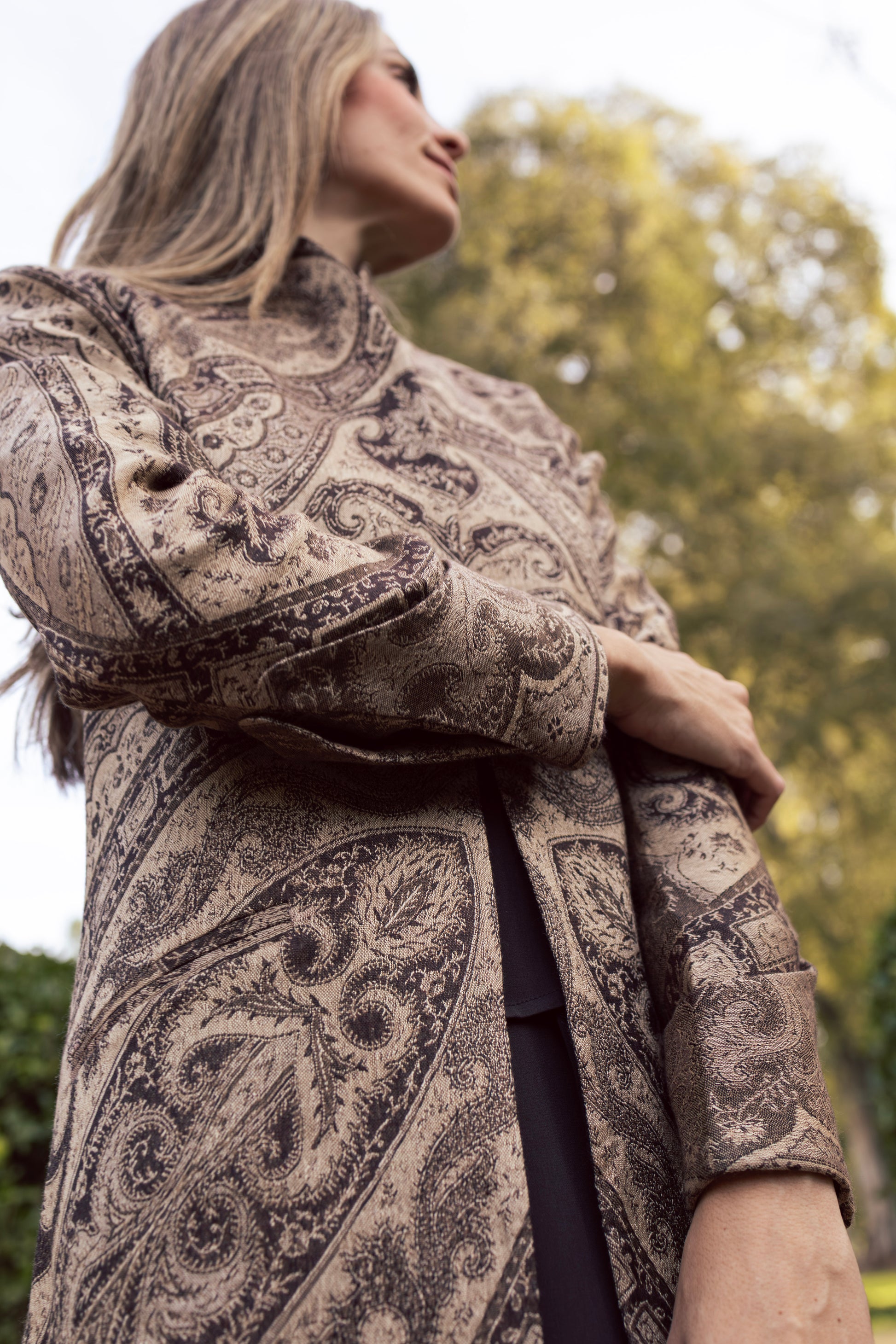 Abrigo largo confeccionado en una mezcla premium de 70% cashmere y 30% seda, un tejido cálido, suave y con una caída muy fluida. Presenta un estampado paisley en tonos beige y marrones que aporta personalidad y un acabado cuidado.