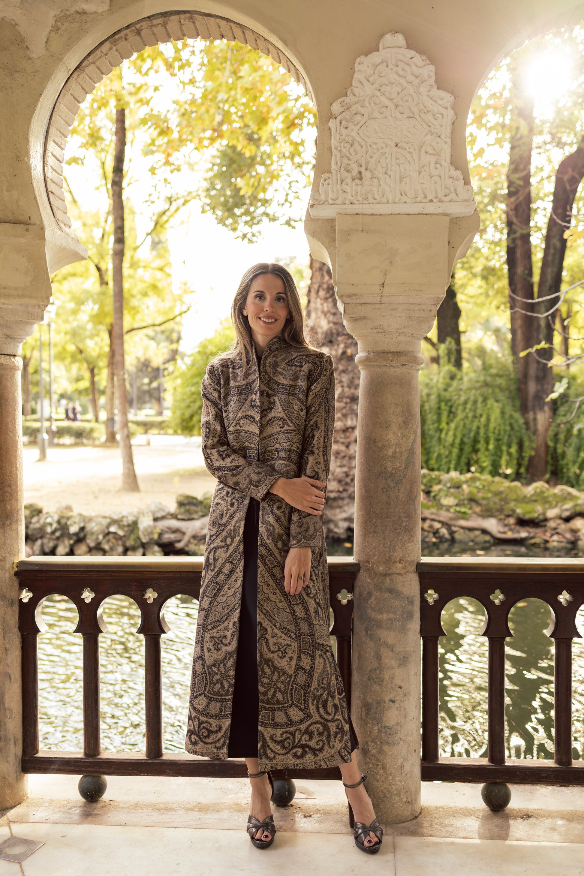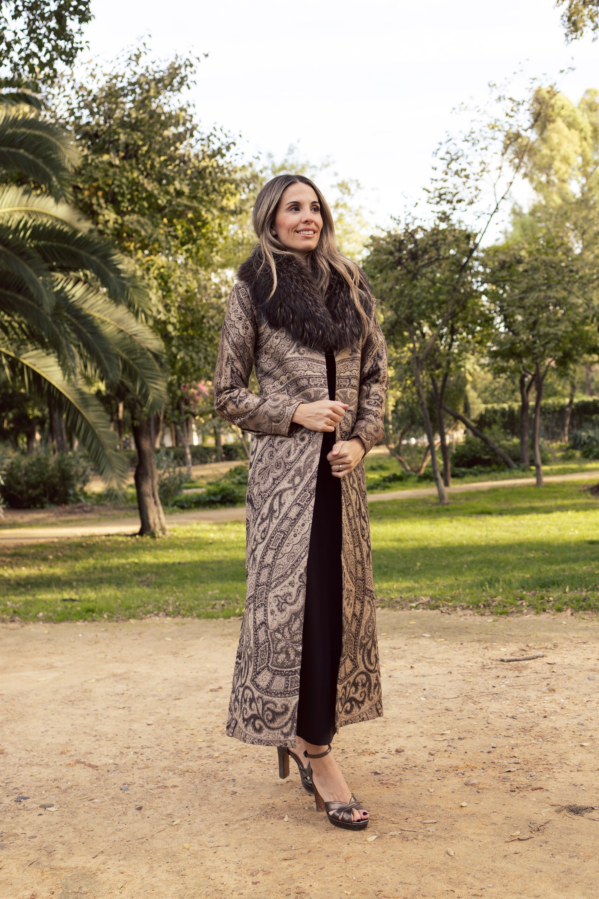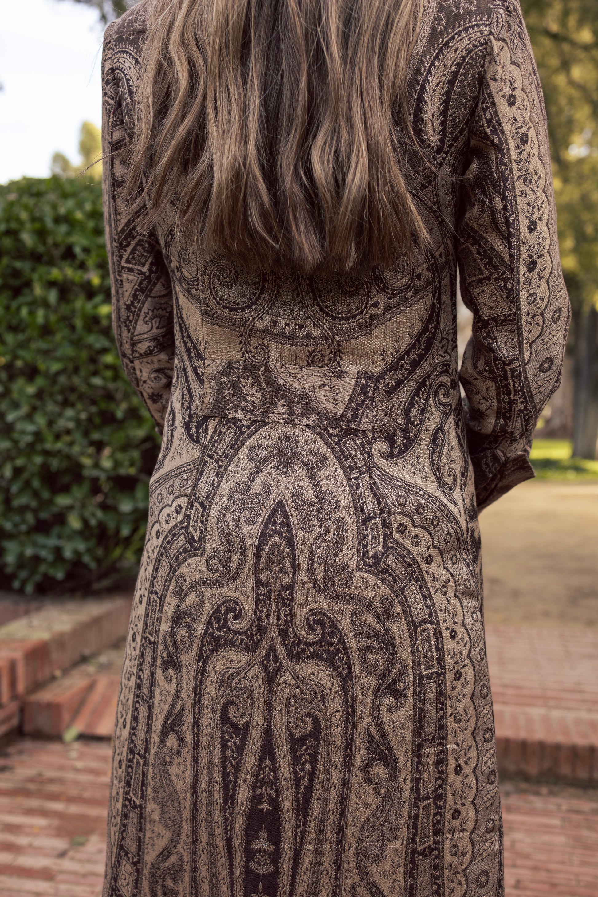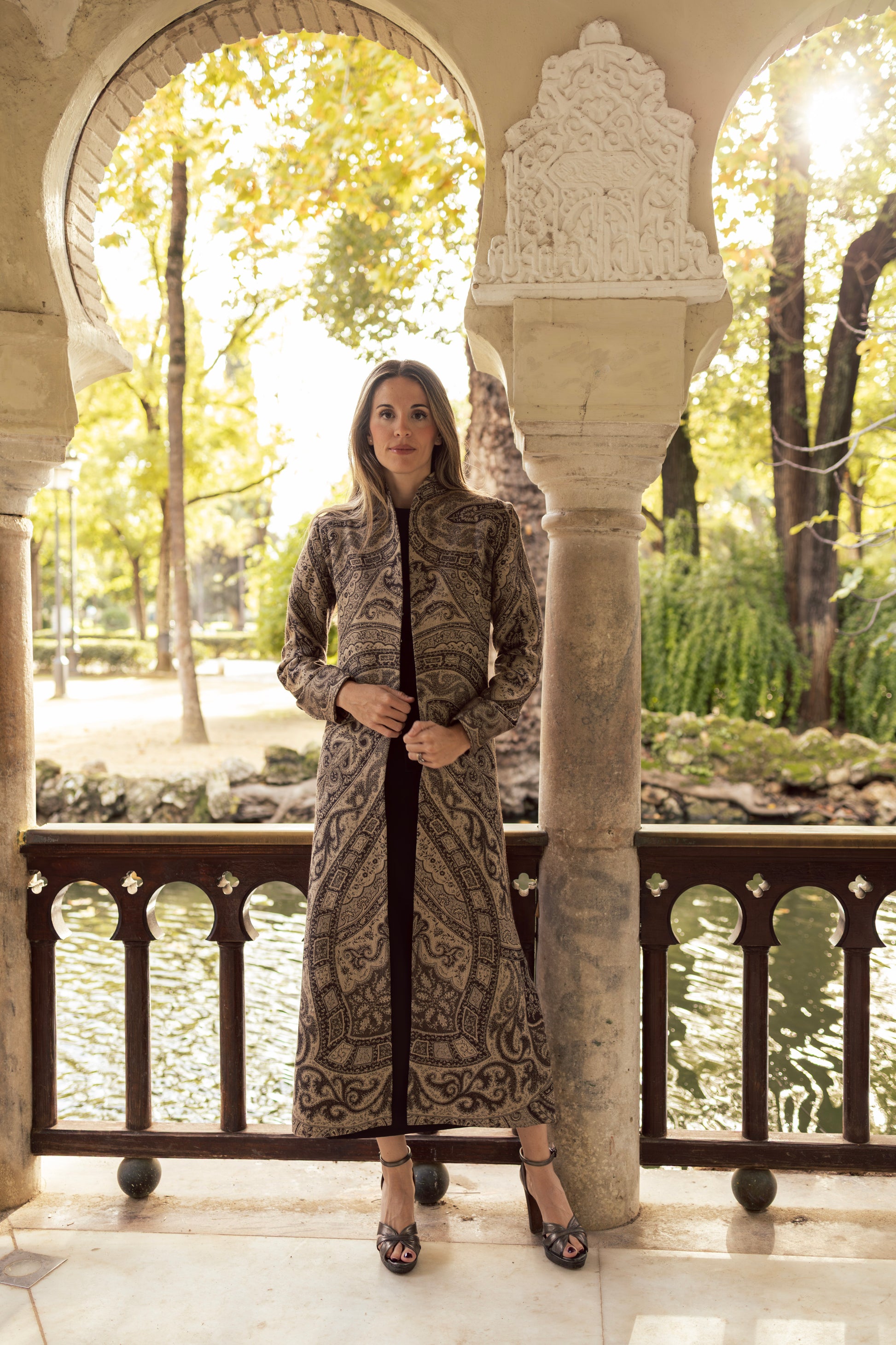 Abrigo largo confeccionado en una mezcla premium de 70% cashmere y 30% seda, un tejido cálido, suave y con una caída muy fluida. Presenta un estampado paisley en tonos beige y marrones que aporta personalidad y un acabado cuidado.