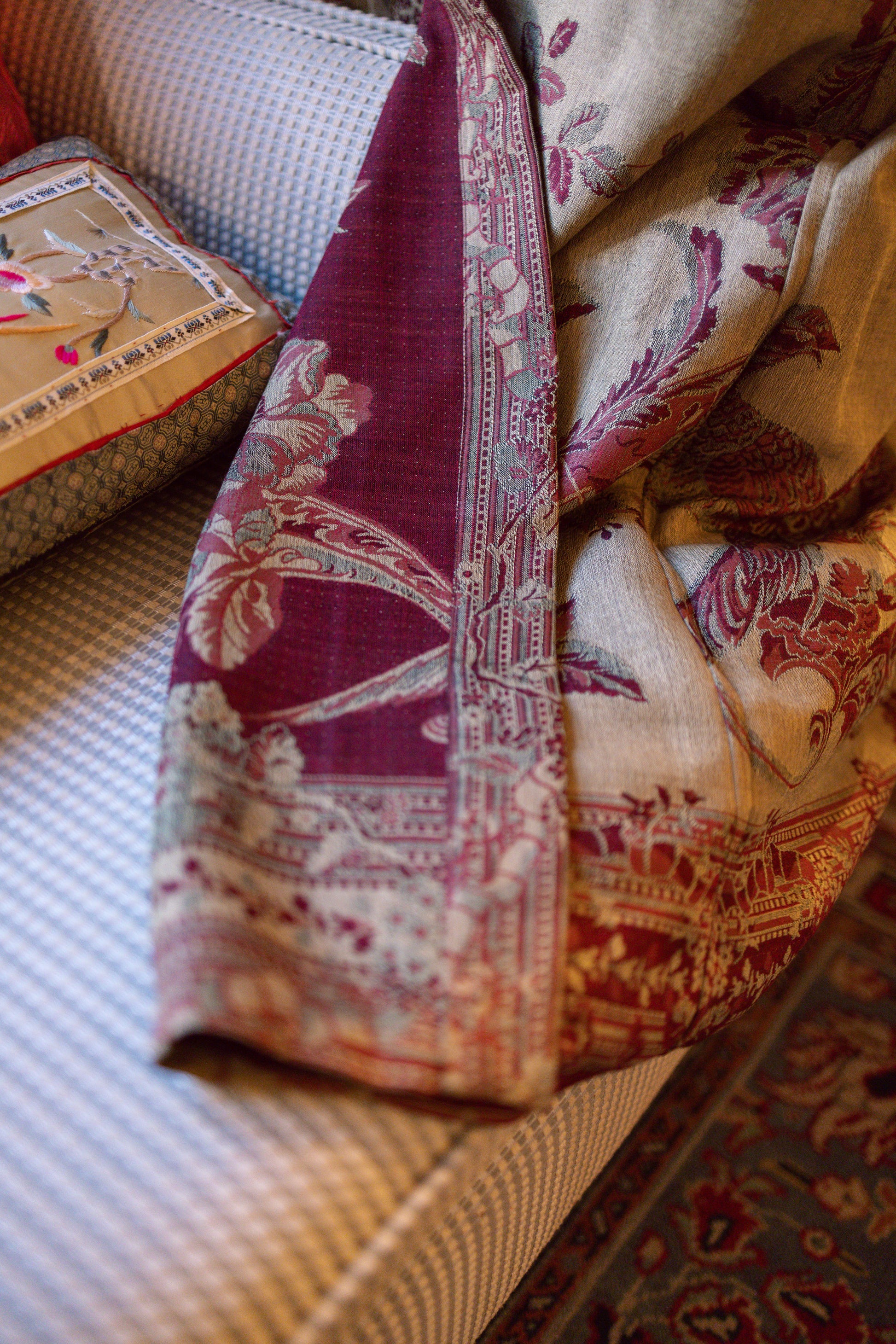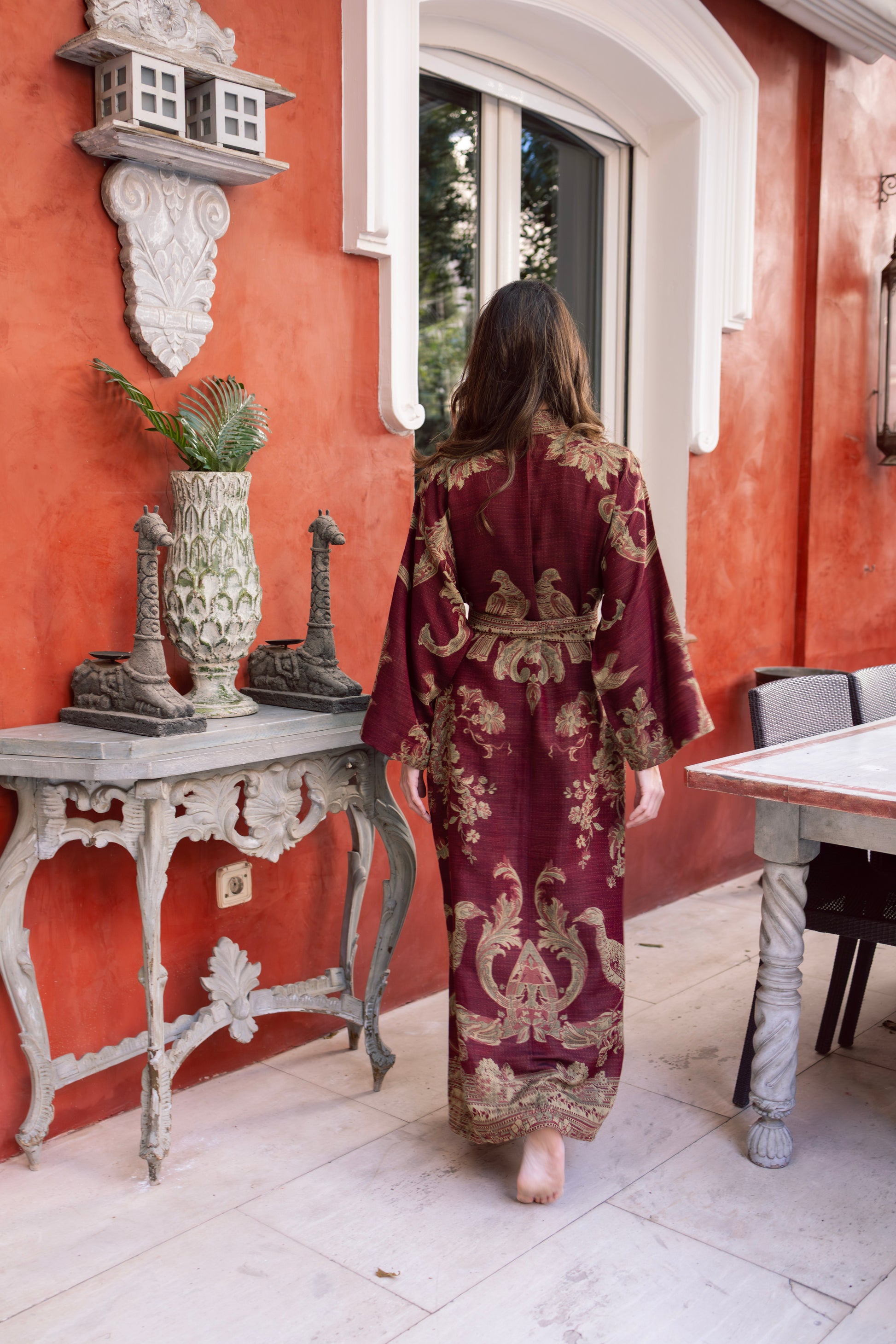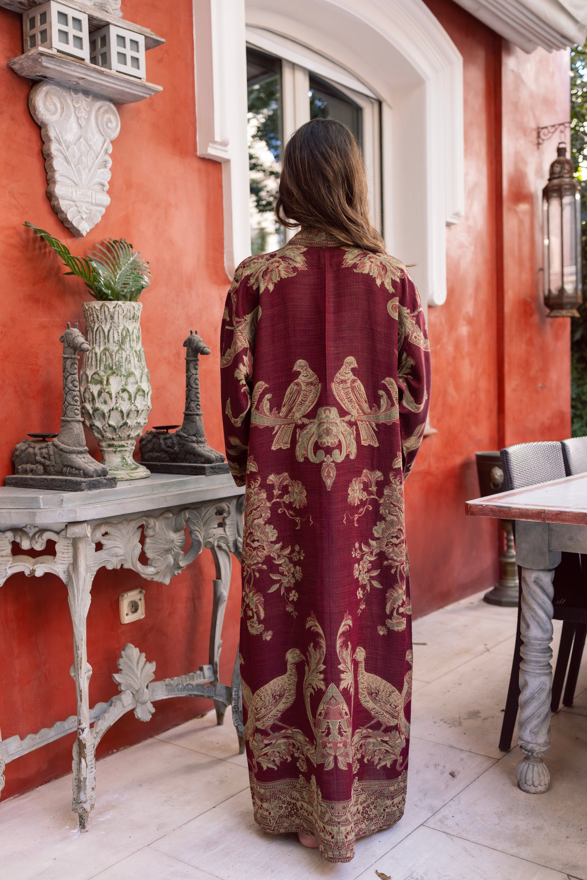 Su diseño se construye a partir de delicados motivos de guirnaldas florales y aves, que se entrelazan como un tapiz ornamental. En una de sus caras predominan los tonos burdeos, enriquecidos con dibujos en verdes y beige; en la otra, los matices verdosos cobran protagonismo, con detalles burdeos que realzan el contraste visual.