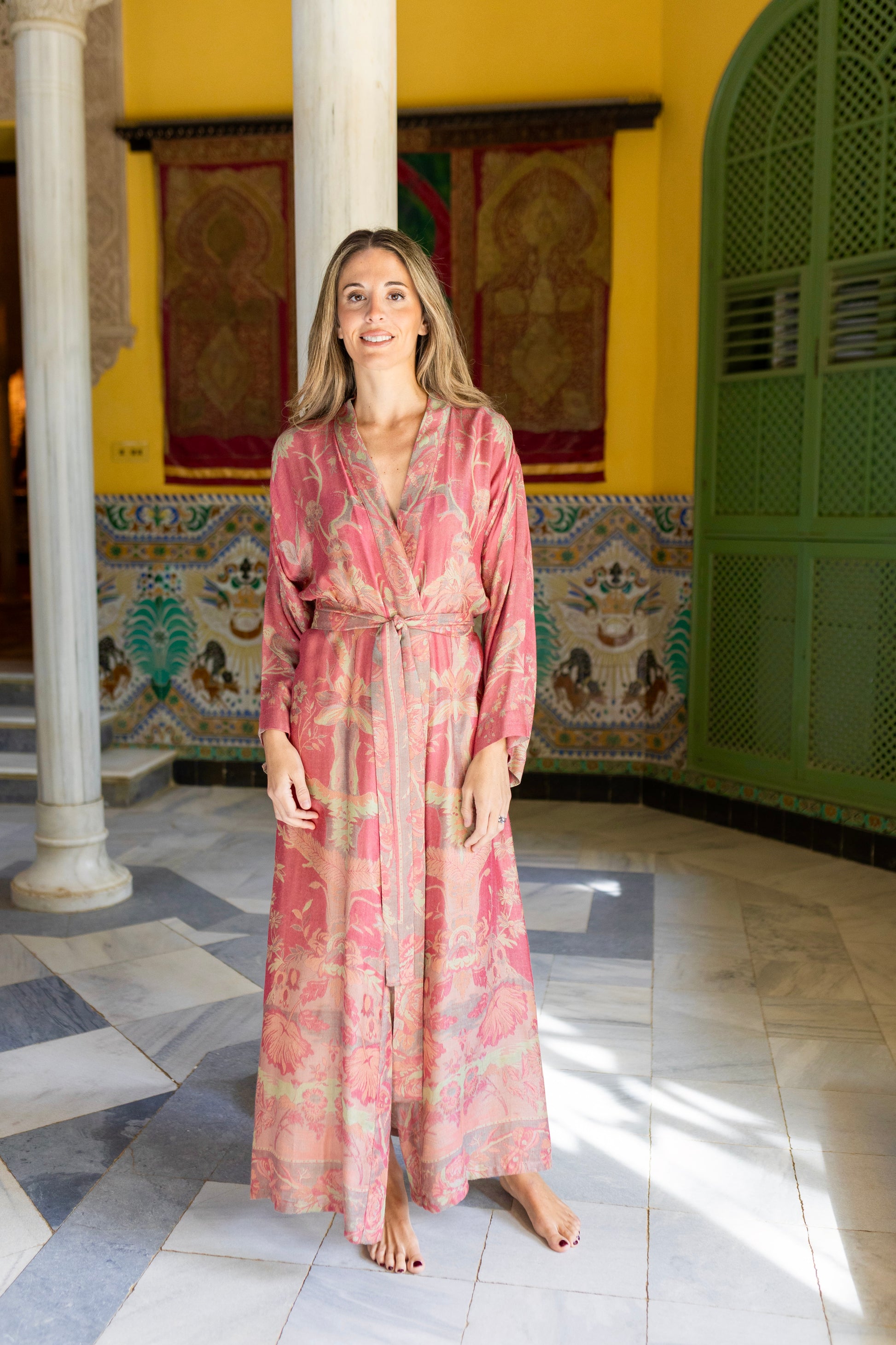 Zaira es una bata reversible, confeccionada en una delicada mezcla de "Cashmere" y "Bamboo silk", con un tacto sedoso y ligero que envuelve el cuerpo con sutileza y fluidez.