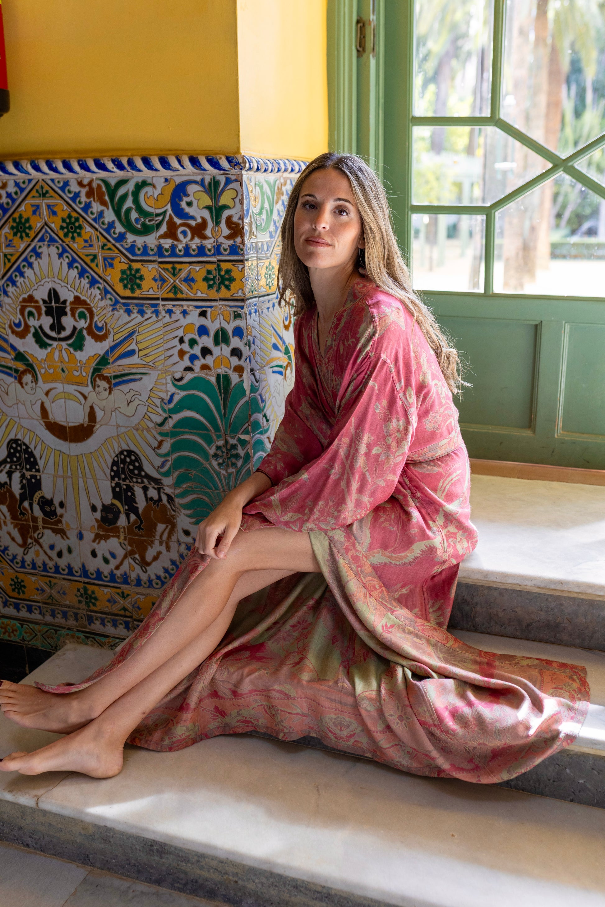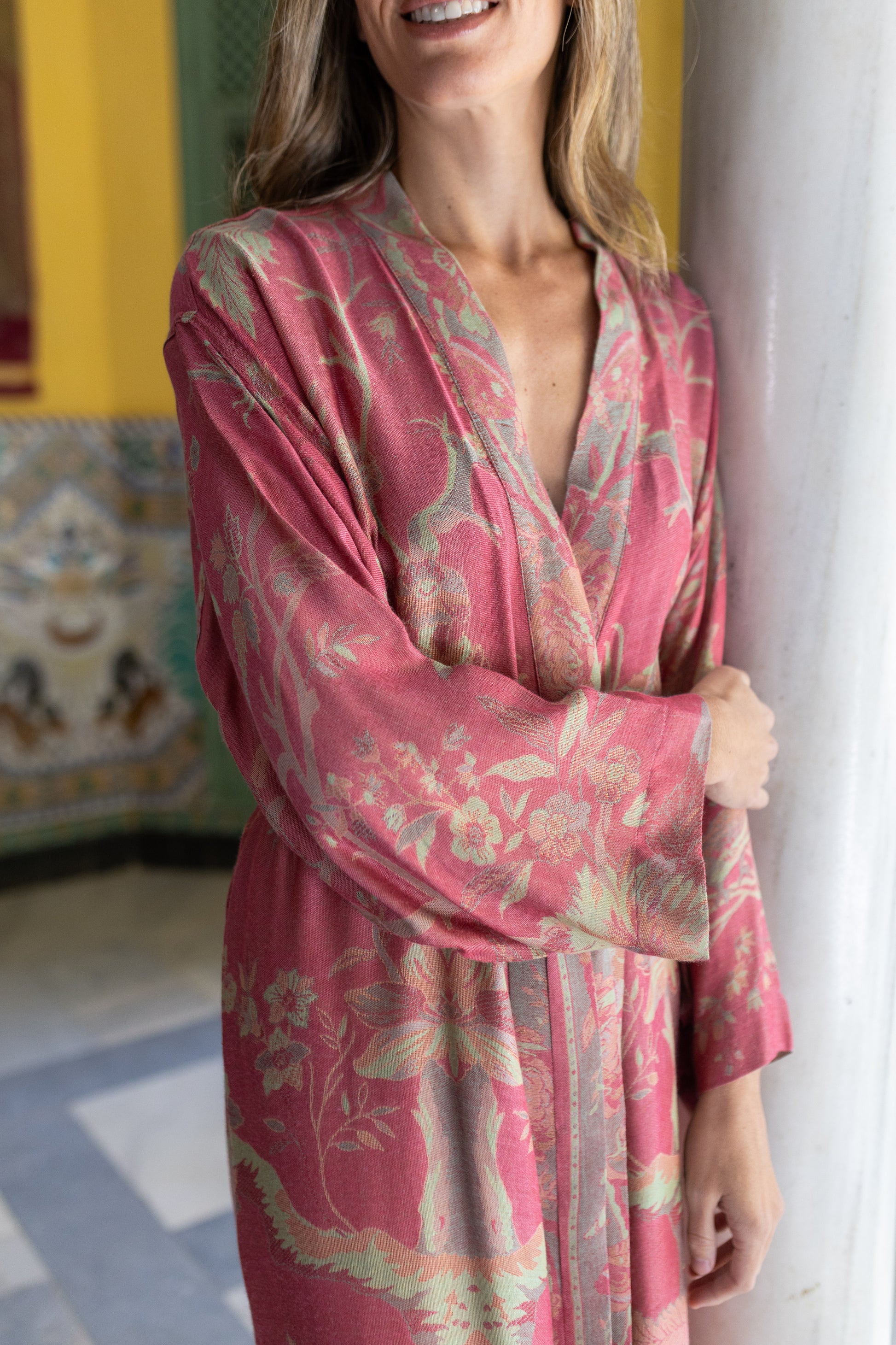 Su estampado vegetal en tonos rosas y verdes irradia vida y luminosidad.
