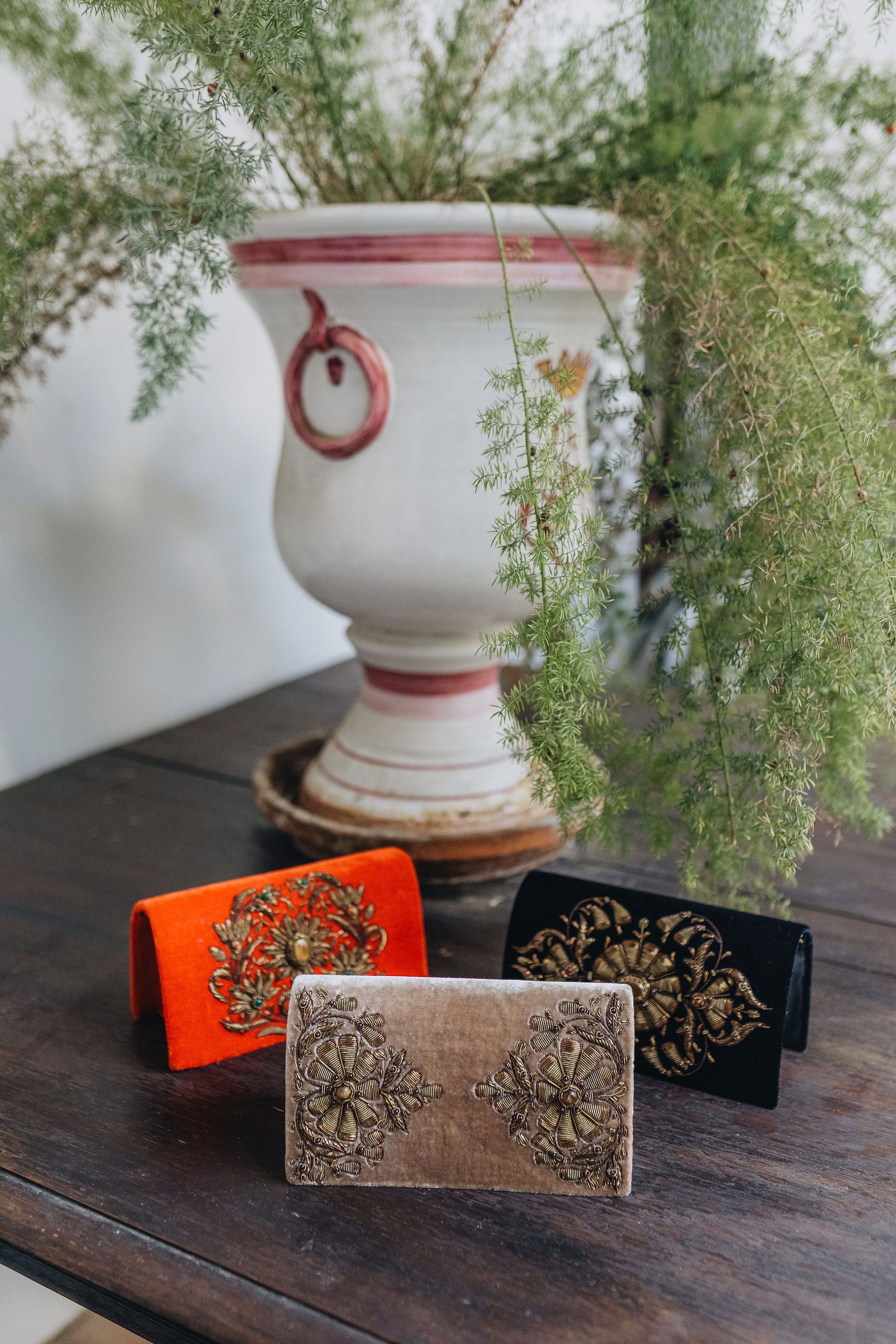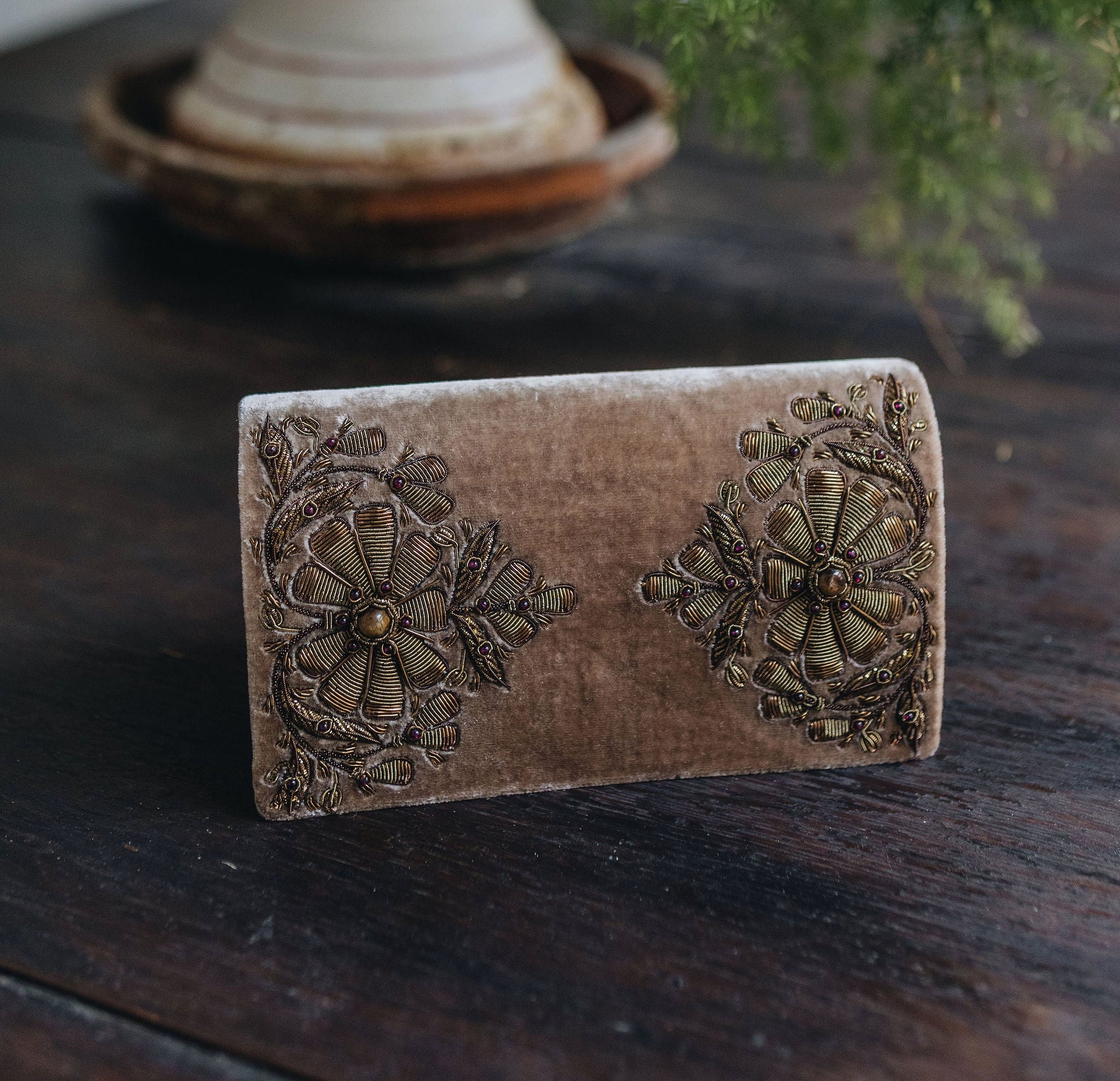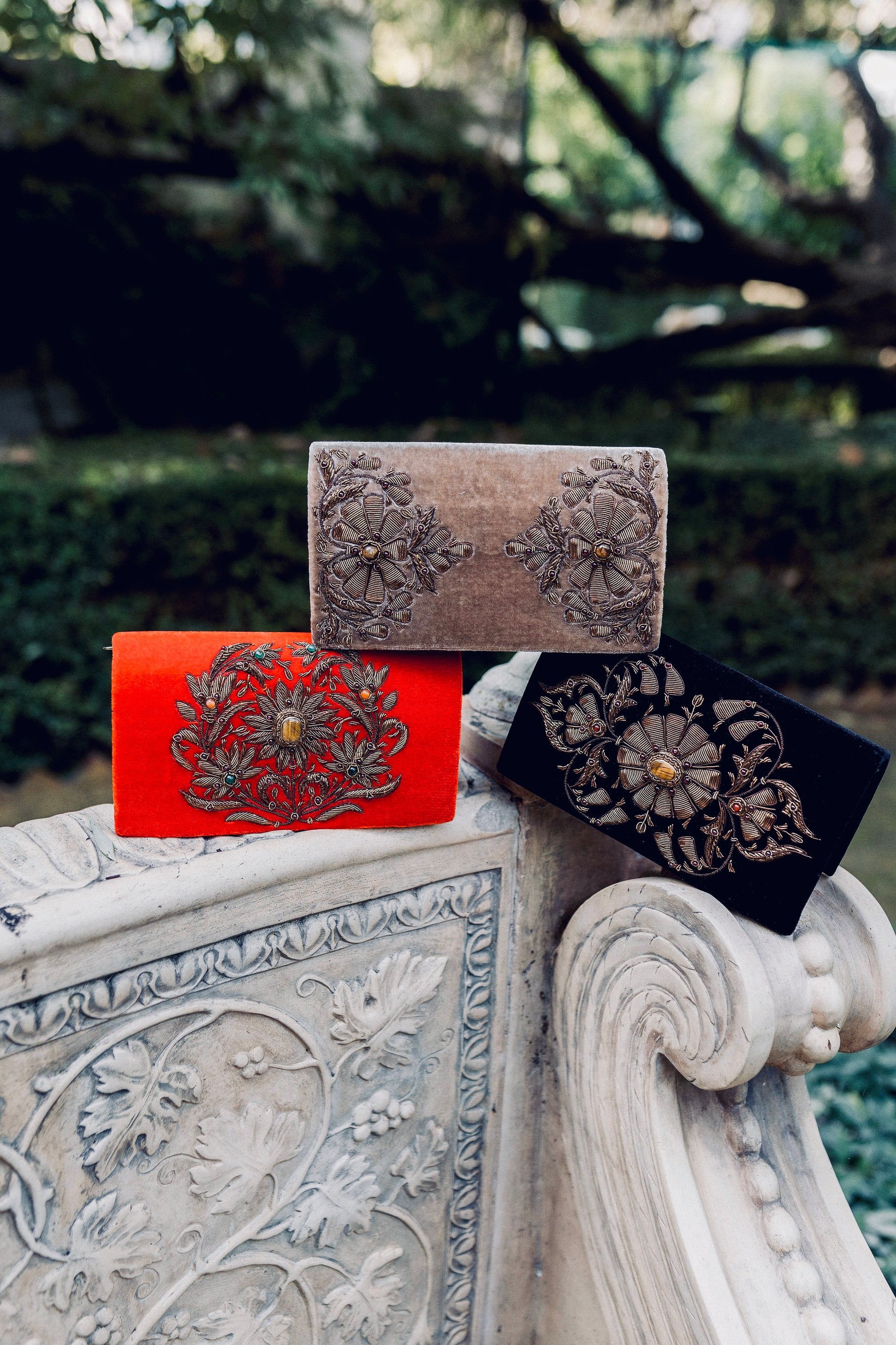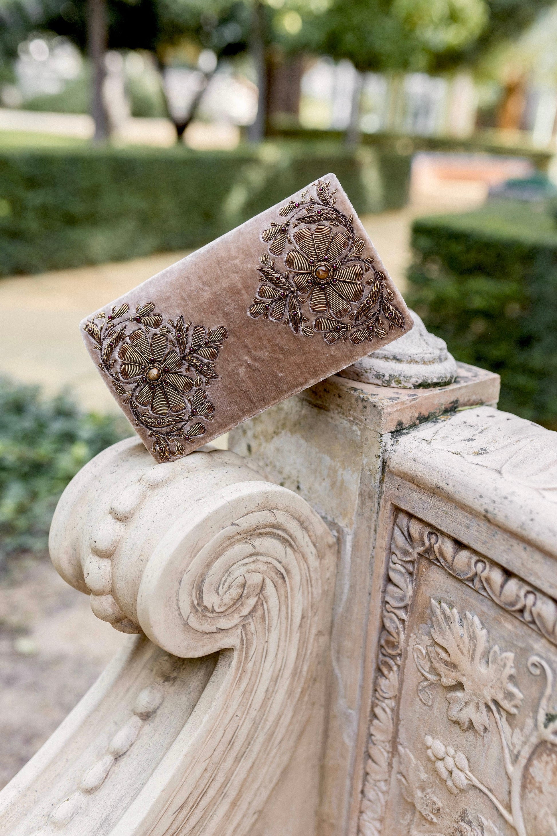 Bolso Joya Luxor es una creación artesanal confeccionada en terciopelo de seda en tono beige suave y bordada en hilos de cobre totalmente a mano. En el frontal destacan dos ojos de tigre naturales acompañados por granates semipreciosos, que aportan un brillo cálido.